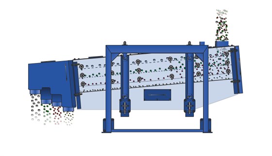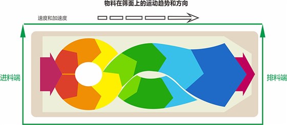 方形搖擺篩啟動(dòng)后,篩機(jī)搖動(dòng)體即篩箱在慣性力的作用下作前后往復(fù)運(yùn)動(dòng),篩箱帶動(dòng)篩面作周期性搖動(dòng),從而使篩面上的物料隨篩箱一同作定向跳躍式運(yùn)動(dòng)。在此期間,小于篩面孔徑的物理通過(guò)篩孔落到下層,成為篩下物,大于篩面孔徑的物料經(jīng)連續(xù)翻滾跳躍運(yùn)動(dòng)后從排料口排出,從而完成篩分工作。
